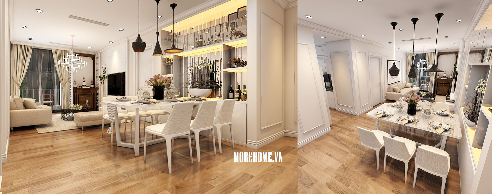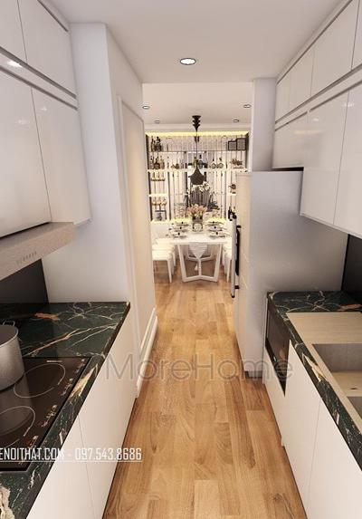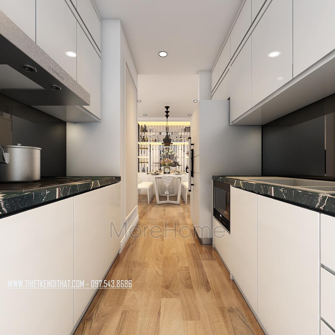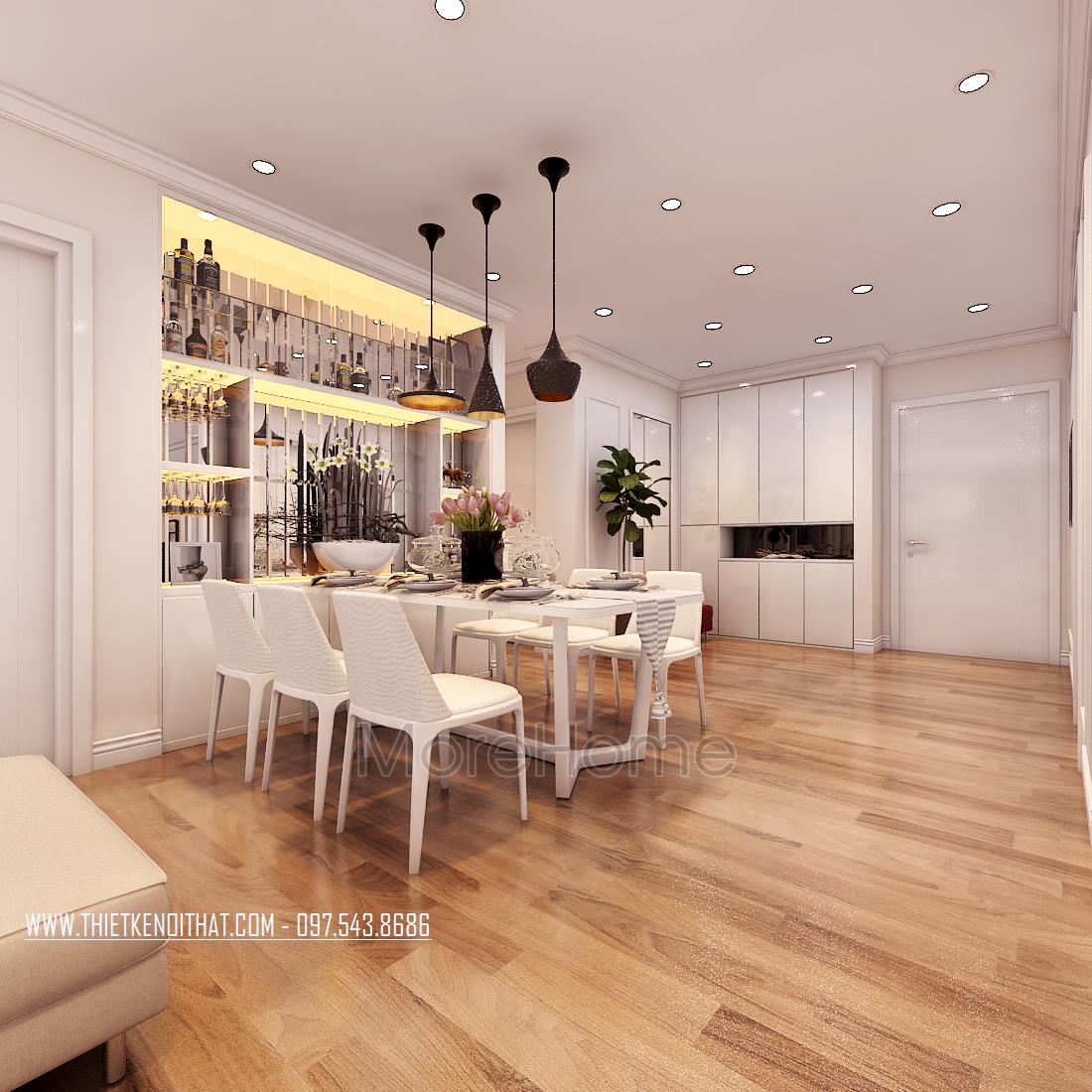 Tiếp theo là thiết kế nội thất căn bếp hiện đại. Tone màu trắng nhẹ nhàng vẫn là điểm nhấn màu sắc tạo sự thống nhất cho không gian sống. Bộ bàn ghế không quá rộng, phù hợp với các gia đình nhỏ hay các bữa tiệc sinh hoạt gia đình đầm ấm. Kệ tủ đa ngăn được sử dụng giúp đảm bảo tính công năng của căn hộ. Một vài điểm nhấn thẩm mỹ như đèn trang trí, lọ hoa, gương phản chiếu, được sử dụng giúp không gian trở nên cuốn hút hơn.
