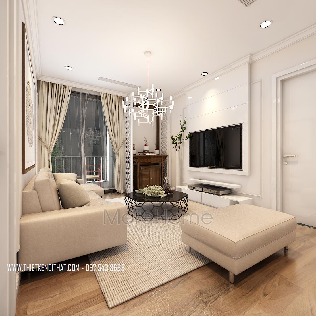 Thiết kế nội thất phòng khách phong cách hiện đại là một trong những thiết kế mở ấn tượng và đầy thu hút. Sắc trắng từ các vật dụng mang đến cho gia chủ cảm giác thoải mái, dễ chịu và vô cùng tinh tế. Bộ sofa được lựa chọn có kiểu dáng khá đơn giản, không cầu kỳ, nhấn mạnh vào chi tiết trang trí nên không hề tạo cảm giác rối và gò bó cho không gian. Ở thiết kế nội thất phòng khách căn chung cư Park Hill này còn khéo léo sử dụng các vật dụng thiết kế sáng tạo như bàn đặt phòng khách, hay đèn chùm giúp không gian trở nên mới lạ và ấn tượng hơn. Ti vi được đặt âm tường theo dụng ý của kiến trúc sư, giúp không gian được gọn gàng hơn nhiều.