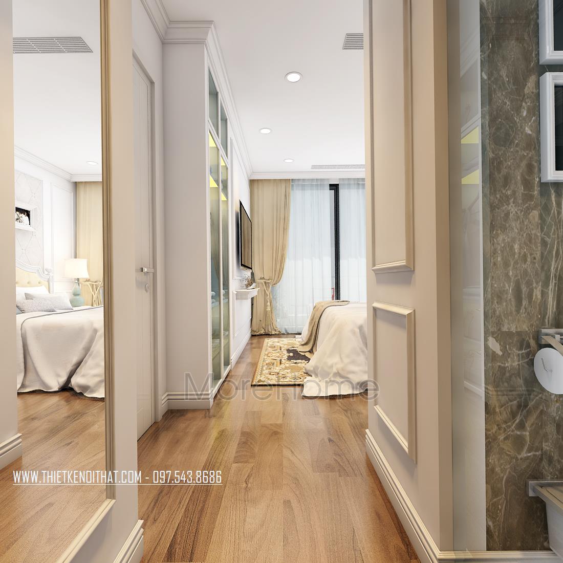 Căn phòng ngủ tân cổ điển sử dụng tone màu vàng nhẹ làm chủ đạo mang lại cảm giác dễ chịu cho gia chủ. Các hoa văn trang trí trên giường ngủ, kệ, tủ được thêm để tạo điểm nhấn tân cổ điển cho thiết kế. Ánh sáng tự nhiên không chỉ được lấy từ khung cửa rộng, mà hơn cả, cách bố trí phòng với gương phản chiếu, và màu sắc sáng, nhẹ cũng góp phần lớn tạo hiệu ứng cho không gian, mang đến cảm giác cơi nới cho căn phòng.