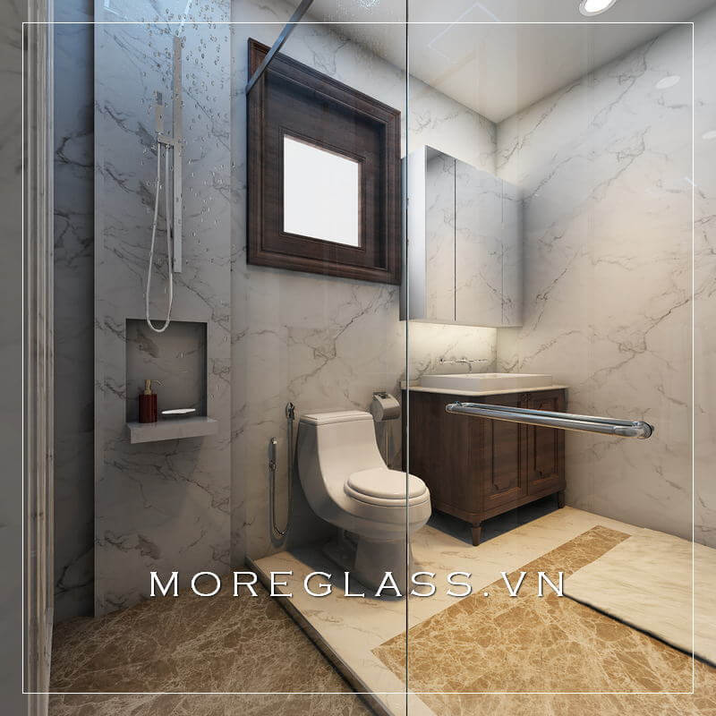 Ngoài việc bố trí phòng tắm hiện đại với vách kính ngăn rộng, còn sử dụng đá ốp tường trắng vân mây nhẹ nhàng thêm phần cao cấp, trẻ trung.