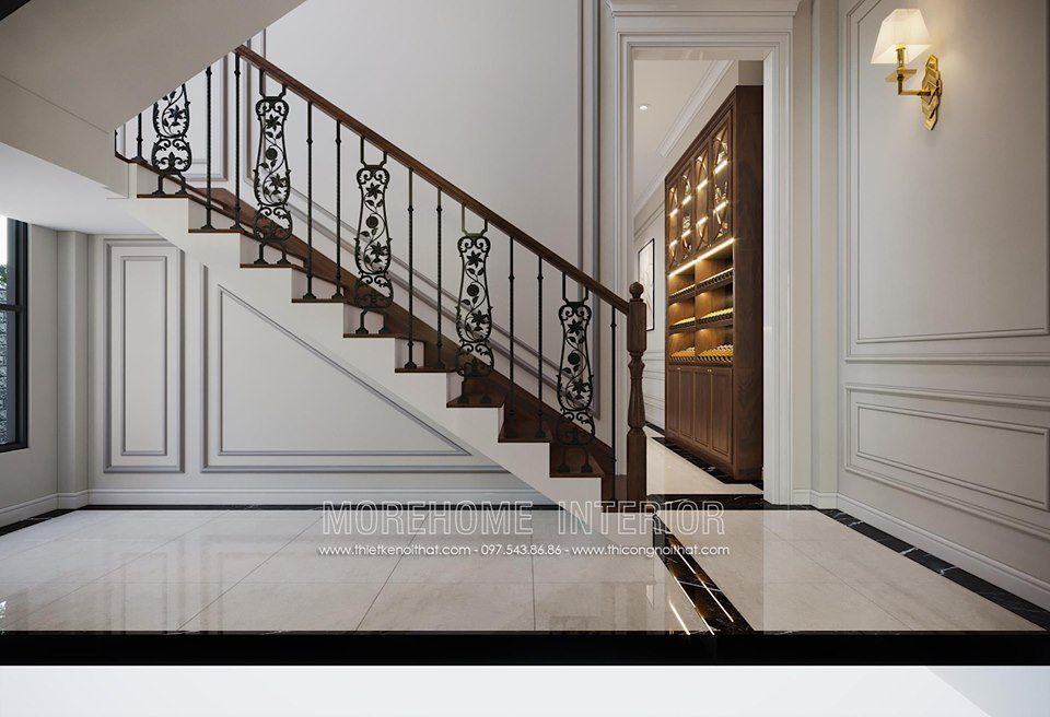 Cầu thang biệt thự tân cổ điển sử dụng gỗ óc chó làm tay vịn mang đến sự ấm áp, gần gũi kết hợp với các song sắt song đôi thoáng đãng, không lo bị che khuất tầm nhìn