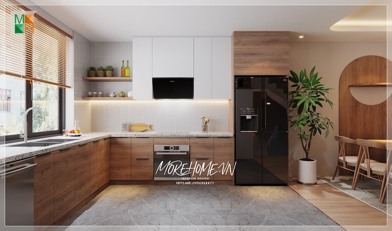 Nội thất phòng bếp được sản xuất từ gỗ mang đến không khí gia đình ấm áp