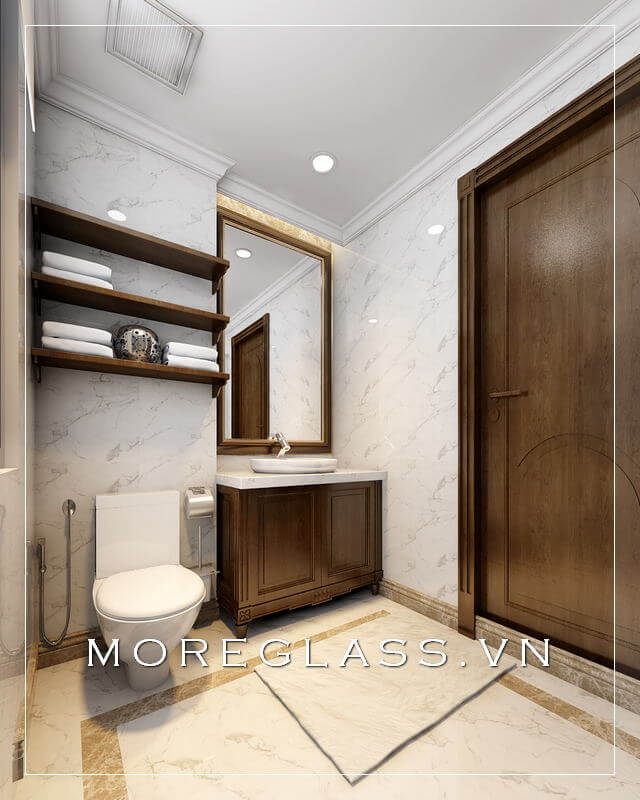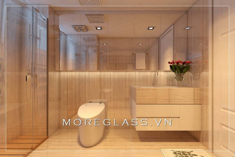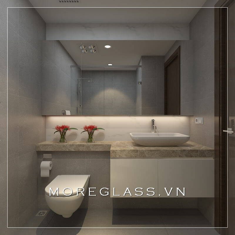 Mẫu thiết kế nhà vệ sinh hiện đại của chung cư đã kết hợp với phòng tắm kính cường lực cao cấp, giúp tạo ra không gian tiện nghi và thoải mái mà không bị chật trội.