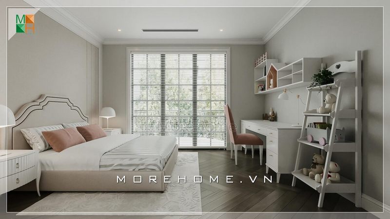 Thiết kế phòng ngủ nhà phố dành riêng cho phái nữ đẹp, sang trọng với phong cách hiện đại, sử dụng tone màu trắng làm chủ đạo, tạo nên một không gian trẻ trung, cao cấp.