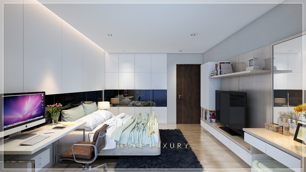 Giường ngủ là trung tâm của phòng với một bộ giường đơn giản, thường là loại platform bed. Điều này giúp tạo sự gọn gàng và tạo cảm giác không gian rộng hơn. Chọn rèm cửa mỏng nhẹ hoặc rèm cửa cuốn để kiểm soát ánh sáng và tạo sự riêng tư.