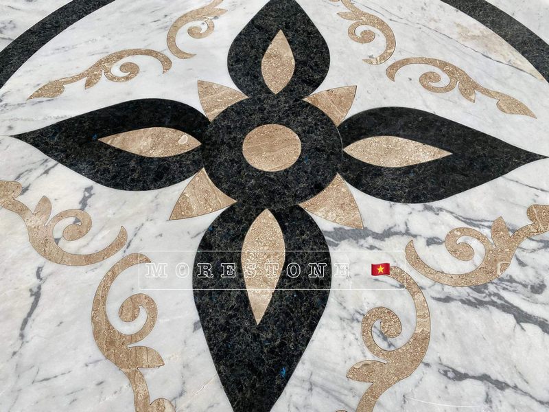 Trên nền sảnh chờ rộng, phòng khách hay điểm nghỉ của cầu thang, mẫu đá trang trí hoa văn làm nổi bật với vẻ tự nhiên của những đường vân cùng nhiều chi tiết đối xứng, hài hòa.