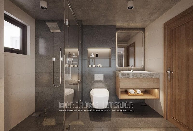 Mẫu thiết kế nhà vệ sinh ốp đá màu xám sang trọng sử dụng các hộc âm tường kết hợp gương treo và vách tắm kính chất lượng tạo nên một không gian lí tưởng