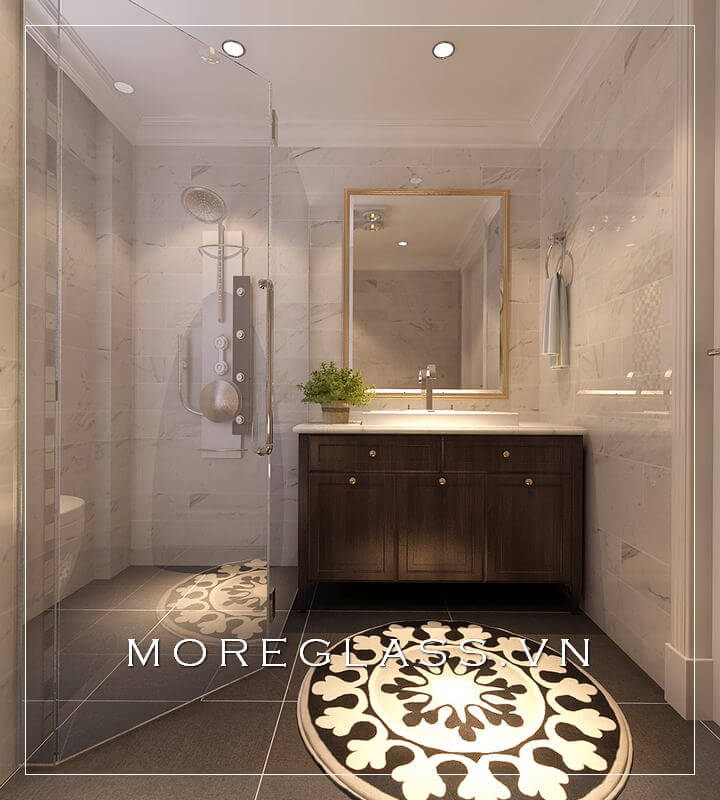 Mẫu thiết kế phòng tắm nhỏ đẹp được trang trí bằng tủ và thiết bị vệ sinh hiện đại, đơn giản. Sử dụng vách ngăn kính cường lực giúp phân chia thành 2 không gian riêng biệt là phòng tắm và khu vệ sinh.