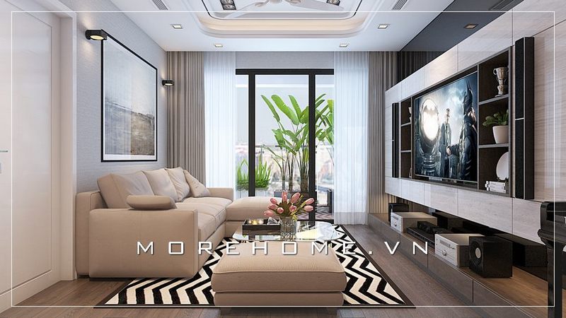 Cửa kính rộng rãi giúp cho ánh sáng tự nhiên từ bên ngoài đến bên trong, làm cho không khí trong phòng khách luôn thông thoáng và đón được nhiều ánh sáng.