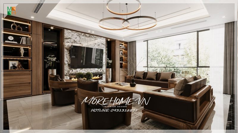 . Tạo ra một không gian trang nhã, sang trọng cho căn hộ cao cấp bằng cách kết hợp nội thất tân cổ điển với nội thất gỗ tự nhiên trong thiết kế phòng khách.